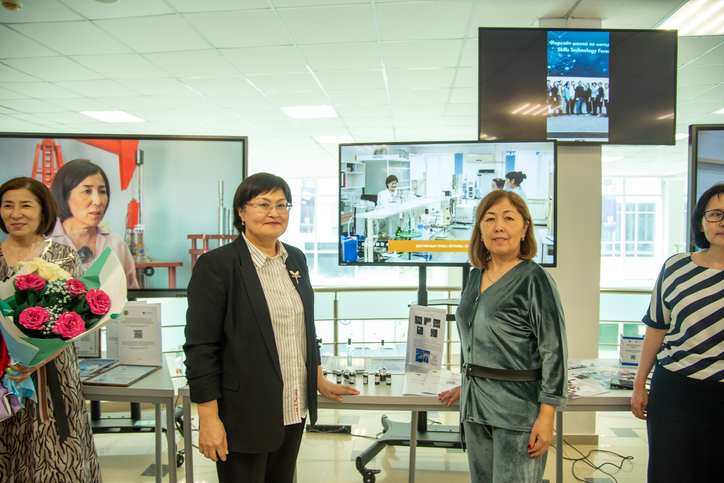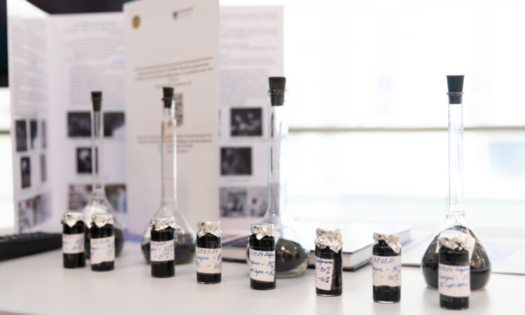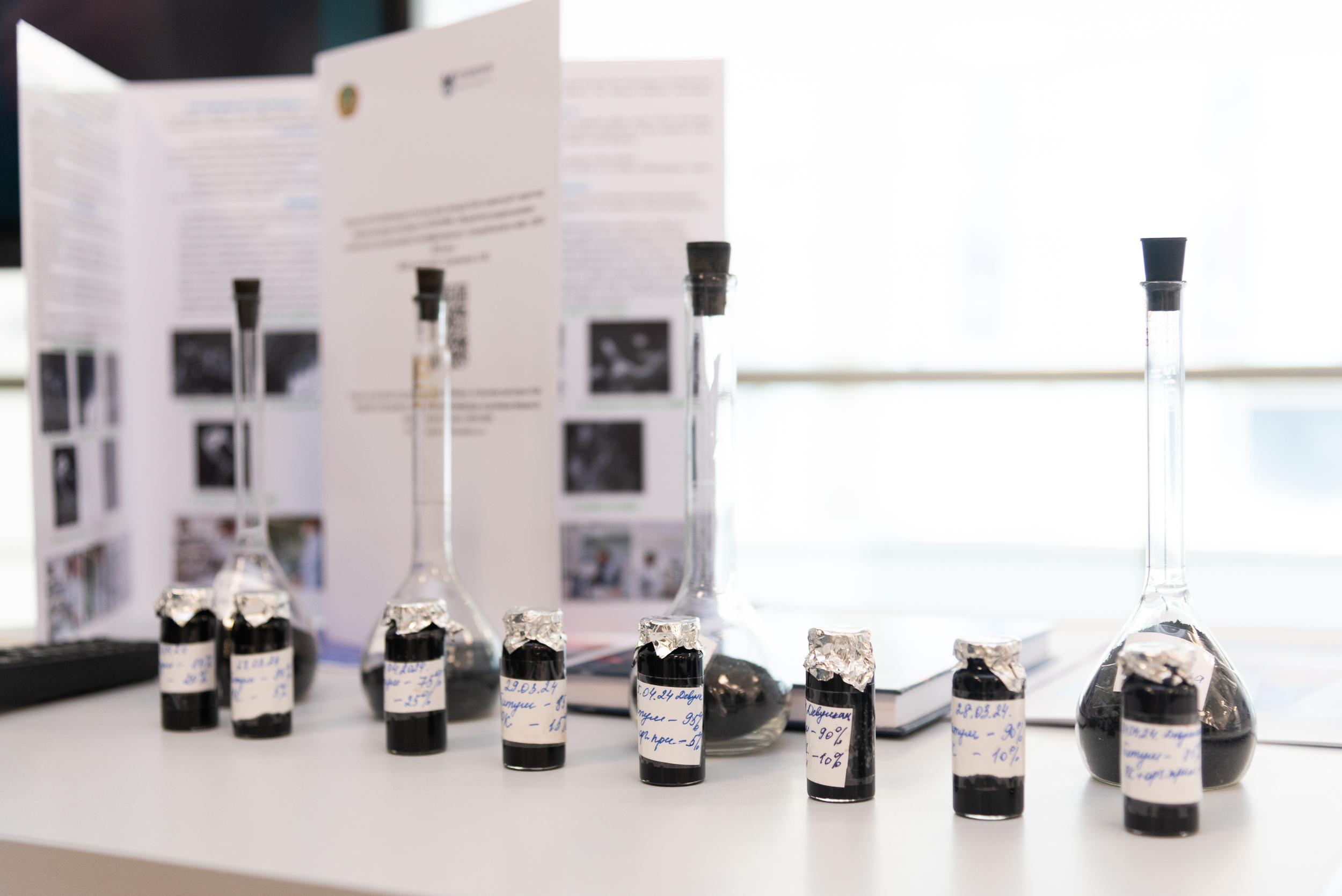 An exhibition of the results of scientific research of grant financing projects was held at the university as part of the month dedicated to Science Day. According to the grant financing project “Modification of petroleum bitumen with rubber waste”, samples of bitumen modified with rubber chips, a mixture of rubber chips and SBS modifier were lined. Publications on the topic of the project were also presented, which were published in the journal of the SCOPUS database and journals recommended by the Committee for Control in the Field of Education and Science.