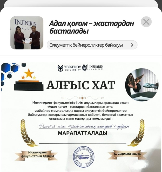 Студенты кафедры геологии и нефтехимического инжиниринга награждены благодарственным письмом.