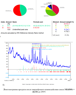 Заметное взаимодействие NН4HSO4 и карбоната калия (K₂CO₃) на кривых ТГА (термографического анализа) начинается выше температурной точки плавления гидросульфата аммония (147℃) с незначительной потерей массы – 2,48% реакционной смеси до достижения температуры 300℃. Присутствующие фазы при этом соответствуют исходному карбонату калия и относительно термически стабильному новому продукту – аммонийкалий сульфату. Повышение температуры приводит его разложению с образованием пиросульфата, затем сульфата калия.