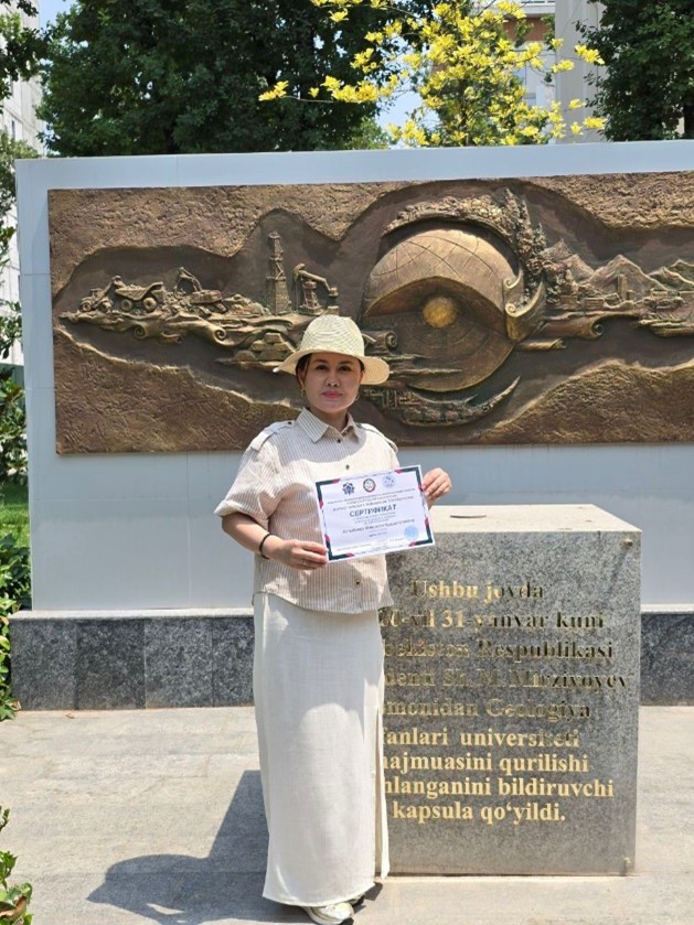Во исполнение проекта» разработка технологий синтеза гранулированного сульфата аммония в условиях АО» КазАзот «докторант 2 курса по образовательной программе» Экология » Алтыбаева Жансауле Кыдыргалиевна, прошла зарубежную научную стажировку в Институте геологии и геофизики им.Х. М. Абдуллаева, расположенном в городе Ташкенте, Республика Узбекистан.